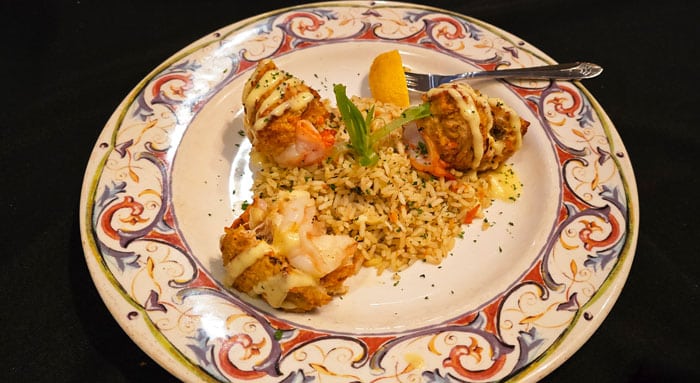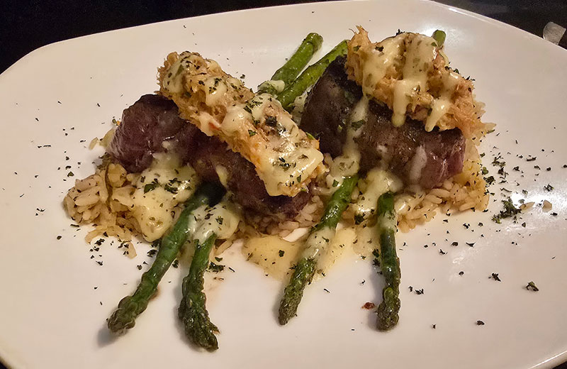 I’d been recently and had the Michael Jordon. In my mind, you really can’t have filet mignon too often, but this time, Bill ordered it and I gave Brandy’s “From the Sea” option, The Simone a try. Take jumbo shrimp stuffed with blue crab blended with fontina, cream, shallots & sherry. Roast until browned, and serve it over rice pilaf with hollandaise sauce on a plate seemingly designed with this dish in mind.