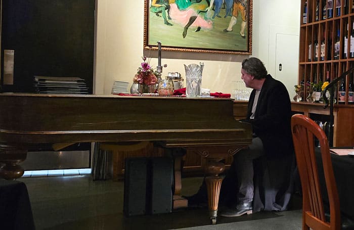 Ambiance is warm, cozy and comfortable: dark-ish, walls covered in art, a pianist at the grand piano, and placed here and there, interesting objects like Bruce Jenner’s training shoes from the 1976 Olympics where he won a Gold Medal in the Decathlon.