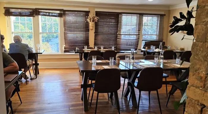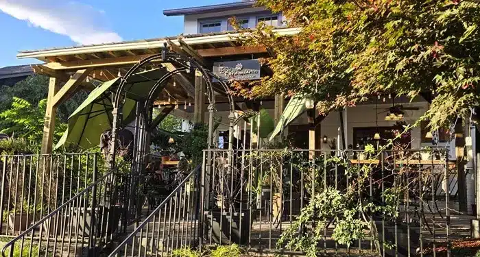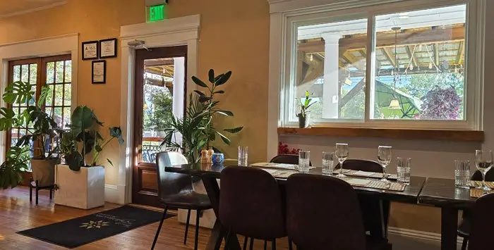 Looking up at the entrance from the street, it felt like it was going to be an adventure getting up the stairs, through the arbor and lush plants, across the porch, and inside this once private home. All the plants made it feel quasi-tropical and semiprivate on the porch. Sit there in nice weather, if you can. The Bohemian Restaurant opened in June of 2023. It’s the previuos location of Hobnob Restaurant.