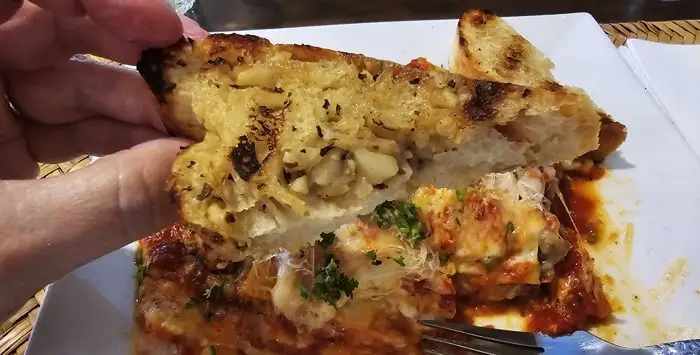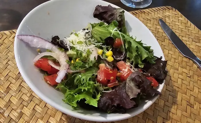 We each had a glass of wine. Bill, Scarlett Vine Cabernet (Maipo, Chile) and me, Ely Cabernet (Paso Robles, CA). Their menu isn’t huge, but there’s a nice variety. Bill’s first course, Soup du Jour Creamy Crab Bisque was good. My Side Salad had some chopped tomatoe, corn, onion, and cheese on spring mix. The dressing – light and mildly sweet – was one of the best I’ve had.
