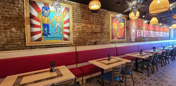 They did a LOT of the build-out themselves, including a shiny brand new kitchen in back and lots of rewiring and tiling. Interesting to note, they discovered original exterior windows under drywall in the rear dining area. They couldn’t be saved, so the spaces were tiled over. Murals on the walls were hand-painted by a guy they know and brought in from Texas.